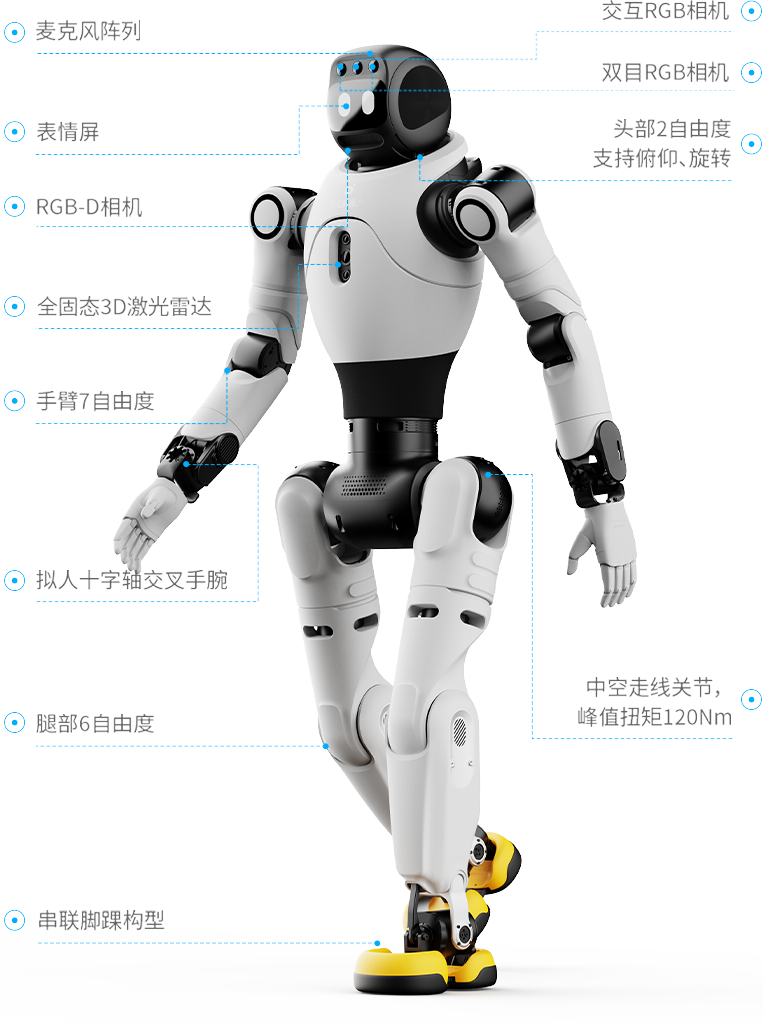 27-31个身体自由度,包含2个头部自由度、3个腰部自由度,动作灵活多变、生动有趣